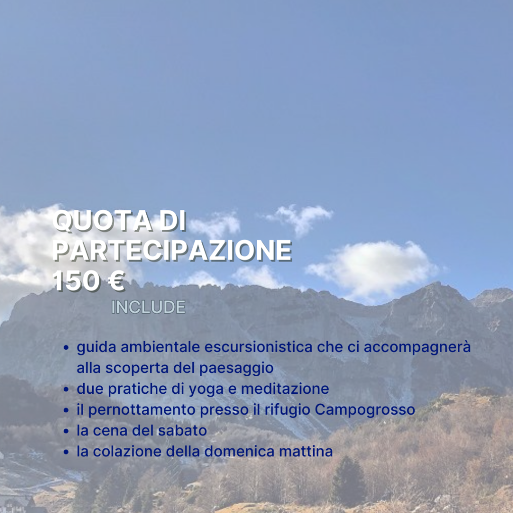 Cammineremo con presenza e curiosità, momento dopo momento, assaporando ogni passo e scoprendo la storia e le peculiarità di questo paesaggio che ci racconterà Federica. Ma assaporeremo anche le pause, pensate per riposare il corpo e lasciare che la mente si accomodi nel momento presente. Arriveremo “in alto”, ma lo faremo seguendo il nostro ritmo, senza fretta né pressione. Praticheremo yoga e mediteremo insieme, per permettere a questa esperienza di arrivare ancor più in profondità. E poi ritorneremo a valle, con la consapevolezza di portare con noi un pezzo di quella vetta e di quell’immensità.